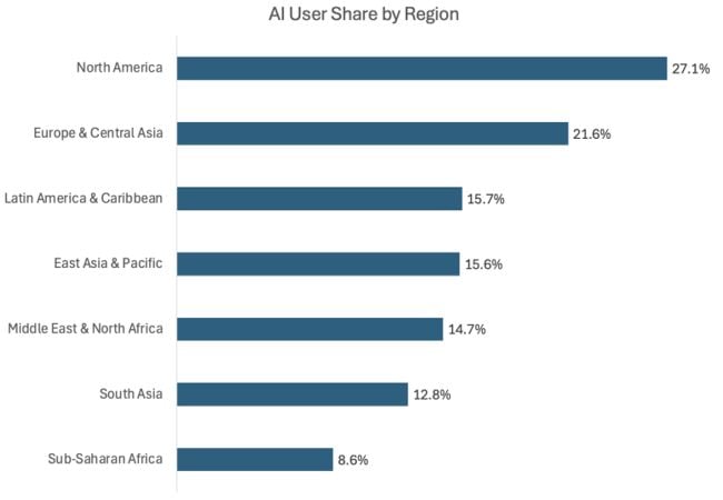 En términos generales la evaluación de Microsoft muestra que existe un paralelo lógico y esperable entre el desarrollo de un país y el uso de las herramientas de inteligencia artificial. Quienes tienen mayores ingresos están aprovechando más la nueva tecnología.