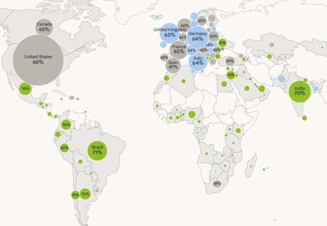 En Europa y Estados Unidos la mirada positiva ronda el 66%. Es importante notar que la encuesta se realiza entre usuarios de IA.