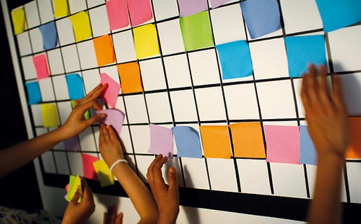 Campuseros y visitantes de Campus Party 2010, se divierten creando música con la ayuda de Post-it de diferentes colores, que colocan sobre un tablero cuadriculado interactivo que define el ritmo de las melodías.