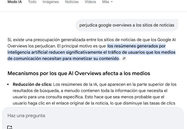 En efecto, el lector puede observar que al realizar un búsqueda en Google se ofrece una visión general creada por IA. Los textos que aparecen allí suelen ser precisos y están tomados de varios sitios. Aunque los enlaces de las fuentes aparecen, en una gran cantidad de ocasiones la información es lo suficientemente completa como para satisfacer la consulta. Por lo que resulta innecesario adentrarse en los sitios.