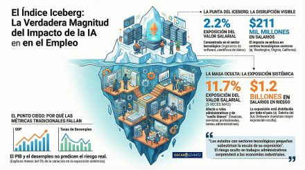 Representación conceptual del llamado “efecto iceberg” del impacto de la inteligencia artificial en el empleo. La parte visible refleja una exposición limitada y concentrada en sectores tecnológicos (alrededor del 2,2% del valor salarial), mientras que bajo la superficie aparece una exposición mucho mayor y distribuida (hasta 11,7% del valor salarial), asociada a roles administrativos y de cuello blanco. La imagen ilustra que el mayor impacto no siempre es el más visible y que las métricas tradicionales, como desempleo o PIB, capturan solo una fracción del fenómeno.