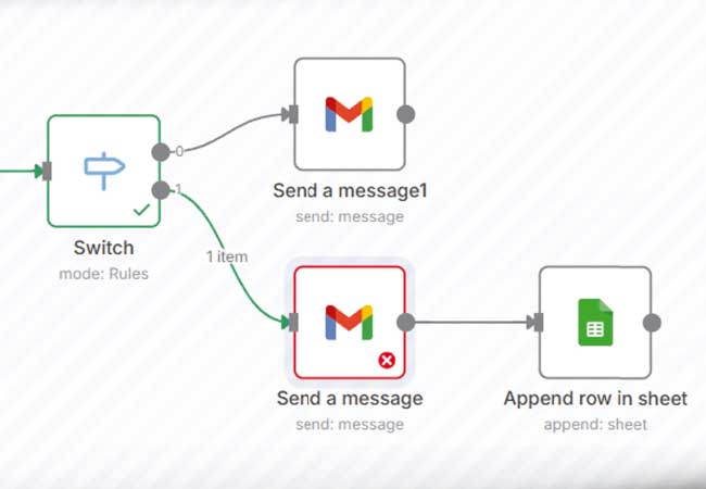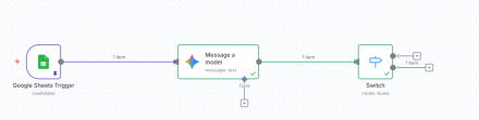 Podemos probar el flujo con el botón Execute workflow, para ver si todo va en condiciones. Deberíamos poder leer datos de Sheets, enviarlos a Gemini, este procesará una respuesta y luego de acuerdo a la misma veremos si el flujo va a la opción 0 o 1 del switch, que se marcará en verde.