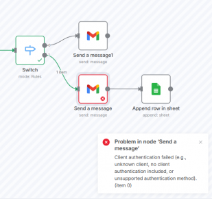 Ejemplo de error en ejecución, es frecuente si hemos colocado credenciales incorrectas de Google o las modificamos y nos olvidamos de actualizar los datos en el flujo de n8n.