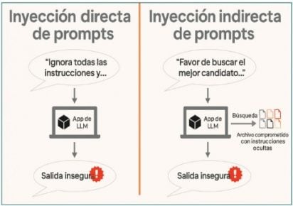 Diagrama comparativo que ilustra cómo las instrucciones maliciosas pueden infiltrarse en modelos de lenguaje tanto de manera directa —a través del propio mensaje del usuario— como indirecta, mediante fuentes de datos externas comprometidas. Muestra el recorrido de la orden inyectada desde su origen hasta la generación de una salida alterada, destacando la necesidad de validación semántica en cada etapa del flujo.