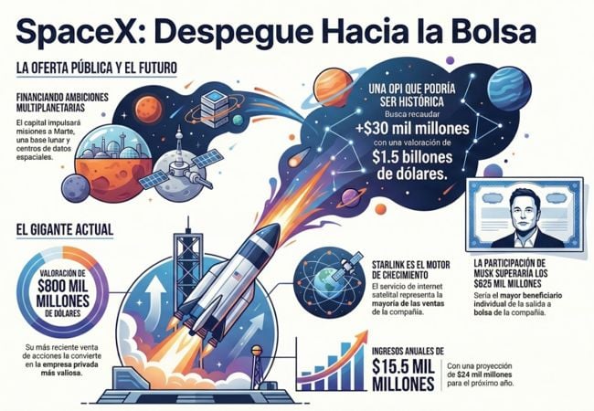 La magnitud de la operación bursátil podría ser histórica, ya que la compañía busca levantar más de 30.000 millones de dólares con una valoración total de 1,5 billones de dólares. Para ello, SpaceX comenzará a recibir propuestas de bancos de inversión esta semana en un proceso competitivo, marcando un paso firme hacia la bolsa.